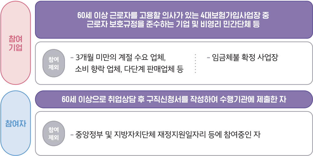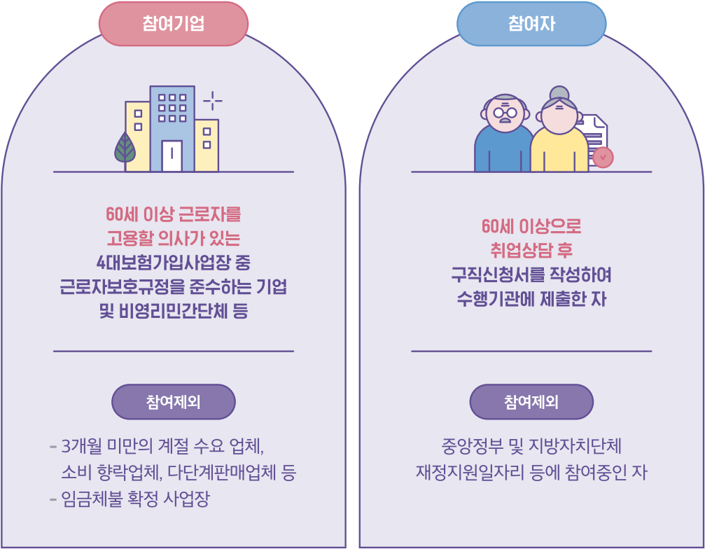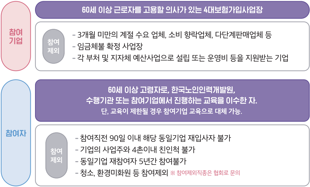 만 60세 이상 고령자를 인턴으로 고용하는 기업에 인건비를 지원하여, 고령자의 취업을 촉진하고 신규 및 계속 고용을 유도하는 사업