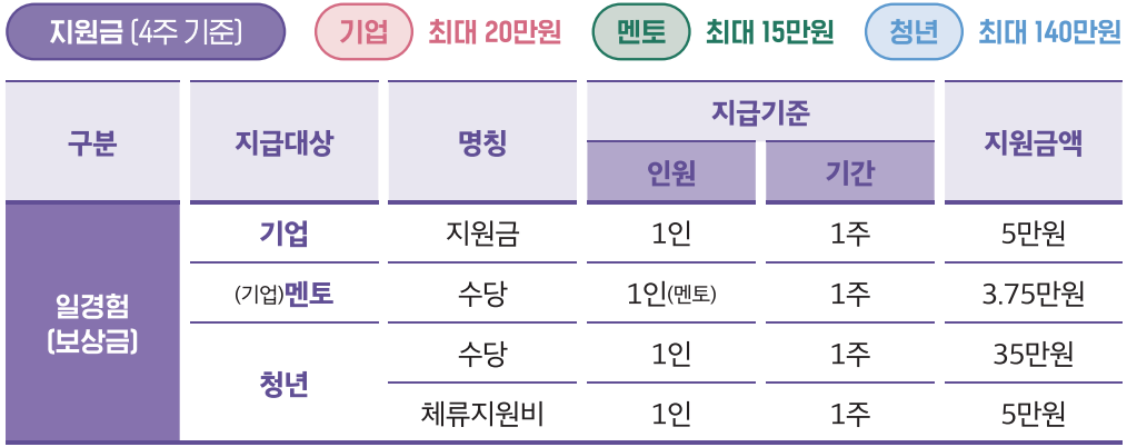 인턴 지원금 입사일로부터 3개월간 매월 최대 40만원 지원 채용 지원금 인턴 기간 종료 후 계속 고용 계약 체결 시, 3개월간 매월 최대 50만원 지원 |